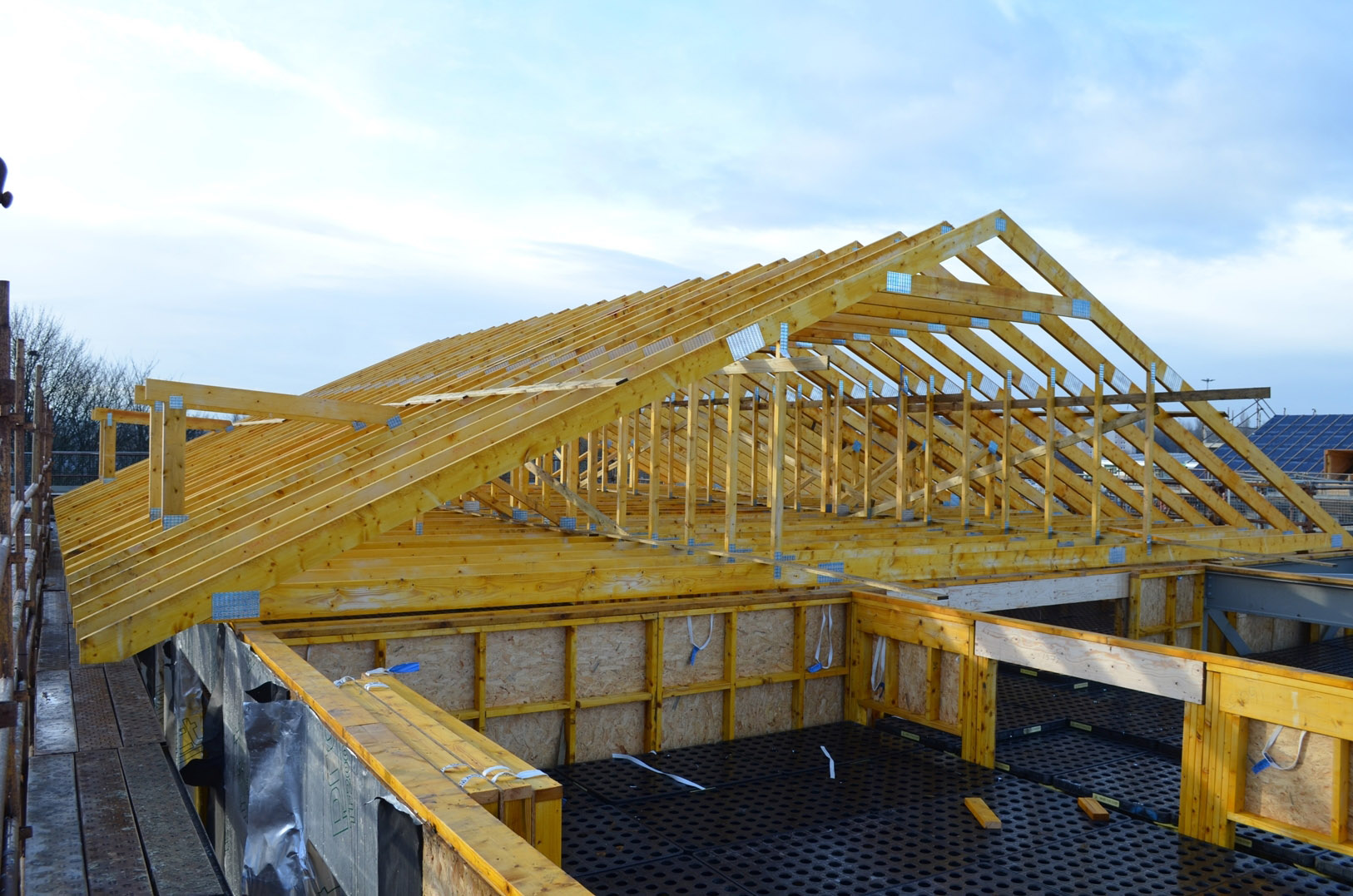 The team at DTE Ilkeston designed and manufactured the roofs for all 55 units, using a Posi-joist solution. Due to the very large scale of the build, wall-to-wall spanning was not possible, so the design team used a series of Kerto beams to break up the large spans, reducing the total by approximately one metre on each end of the joist. The strength of the beams also created a working platform for attaching the roof trusses. This was the first time Kerto beams have been used to support both Posi-joists and trusses together on such a large scale.