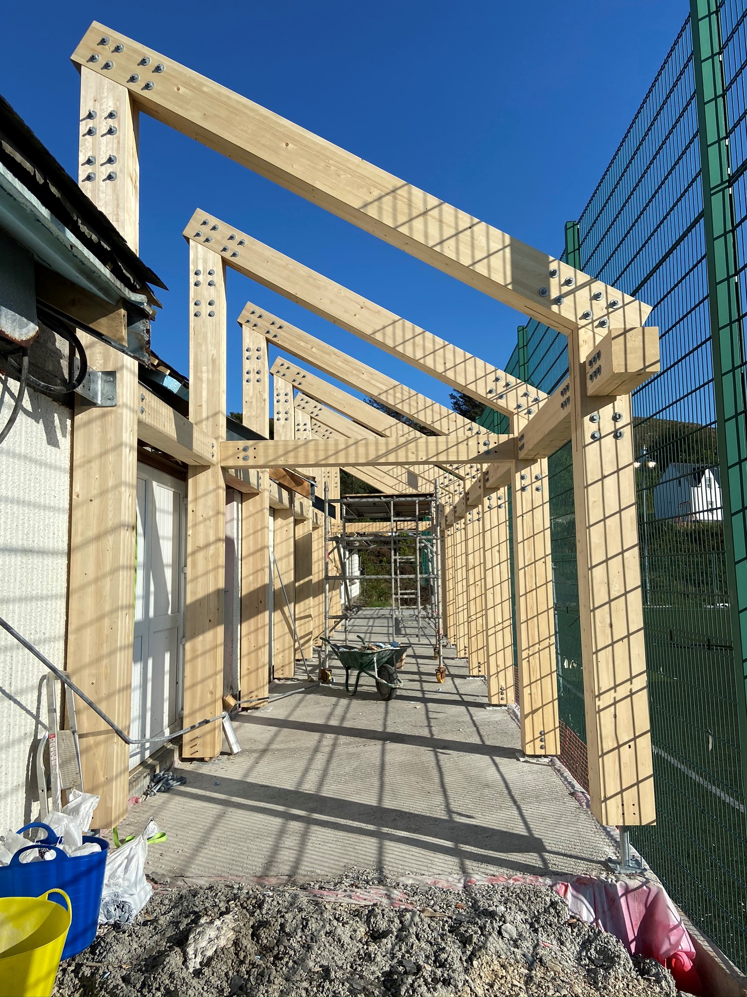 Glulam was specified for this project, because not only does it look striking & beautiful, it can be manufactured in large chunky section sizes, which not only look good but are also structurally very strong. These frames will be a standout feature in the frequently used community building.