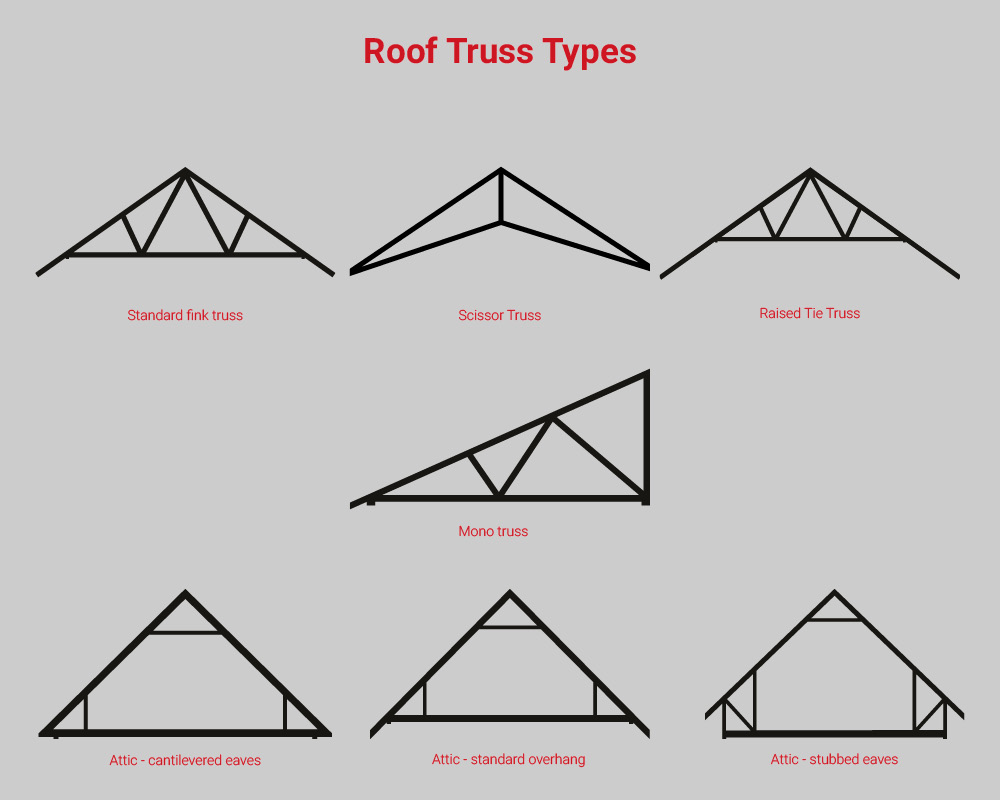 We design all types of roof trusses, some examples are fink trusses, attic trusses, scissor trusses, raised tie trusses and mono trusses to Glulam feature trusses, oak feature trusses and kerto feature trusses. We have outlined some of the different types of roof trusses in our graphic below: